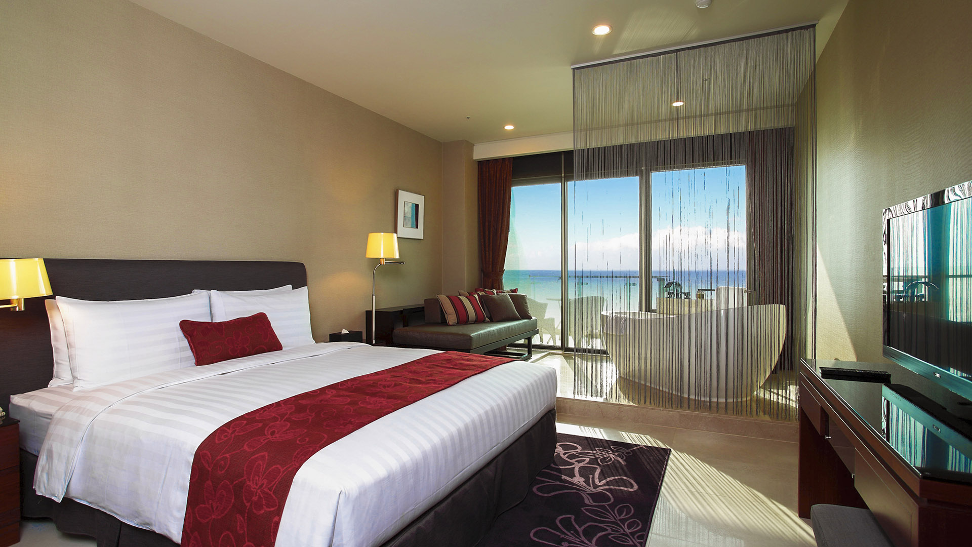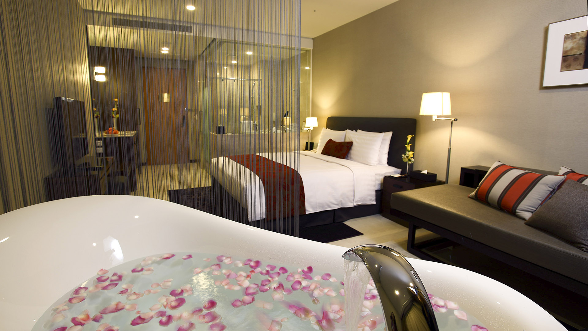壮麗な海の景色を足元に見降ろすことのできる掃き出し窓の前に、デザイナーが丹精込めてつくったたまご型のバスタブをしつらえました。窓の外に広がる真っ青な空と紺碧の海が目の前に迫り、遥か彼方まで続く夜空に満天の星が2人のプライベートなひと時をロマンティックに彩ります。時にはバルコニーにもたれながら胸の中の想いを語り合ったり、大胆に一糸まとわず日光浴をしたり、思い出深い旅のひと時をゆっくりとご堪能ください。
