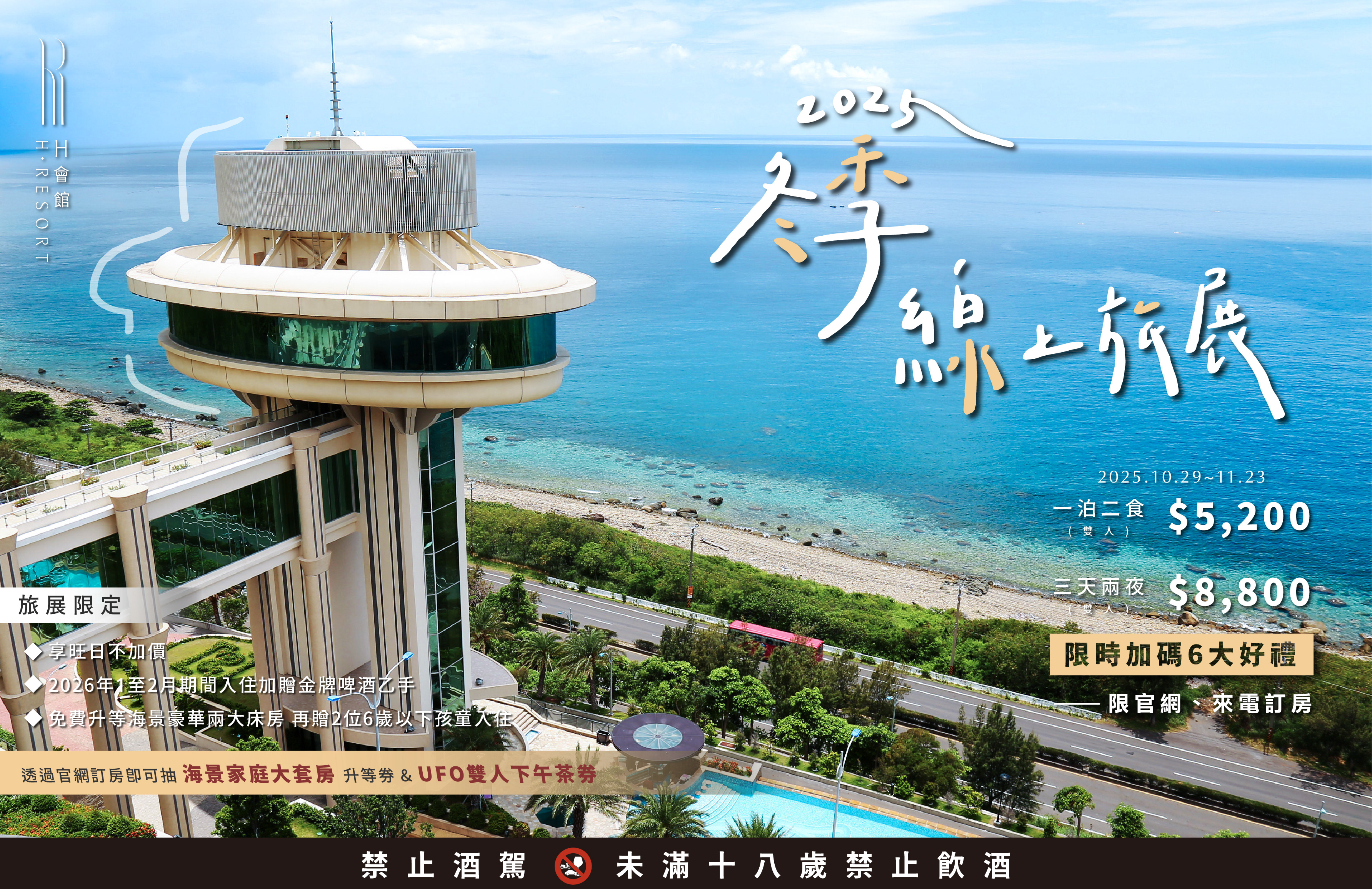 活動期間於官方 FB粉絲專頁〔2025年冬季線上旅展〕指定貼文按讚、Tag兩位好友並留言《#H會館 冬季旅展限定抽,宇宙級享受🛸登上UFO美味直升外太空》即可抽UFO景觀餐廳雙人下午茶券 乙張,共3名,2025年12月10日於官方 FB粉絲專頁公佈獲獎名單。
