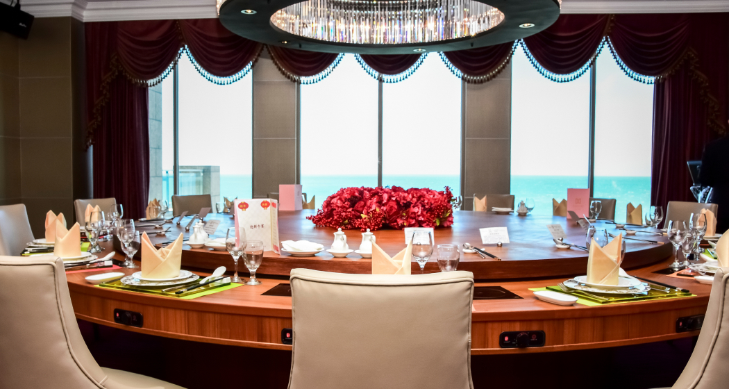 The Banquet Hall, spacious and luxurious, is elegantly decorated with classic logs, complete with a terrace and windows looking out to the expansive sea.