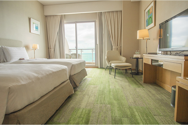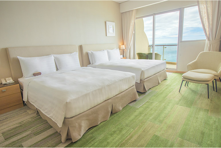 地理的条件に恵まれた当館が丹精込めてつくり上げた125の各種様々な心地よい客室。全ての客室に海に面した足元まで広がる大きな窓があり、シンプルで上品な内装が施されていて、至る所に細やかな気遣いがあふれています。室内には直通の国際電話、無料ADSLインターネット接続、ミニバー、多チャンネル付きテレビ、セーフティーボックス、バスタブ、セパレートシャワーブース、洗練されたアメニティグッズなどを完備し、お客様の多彩なニーズにお応えいたします。伸び伸びと寛げる、まるで自宅のリビングのような雰囲気をご満喫ください。