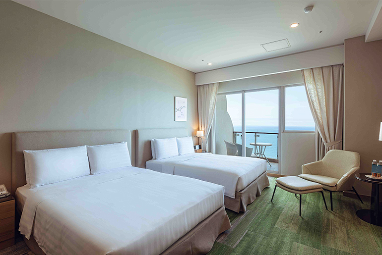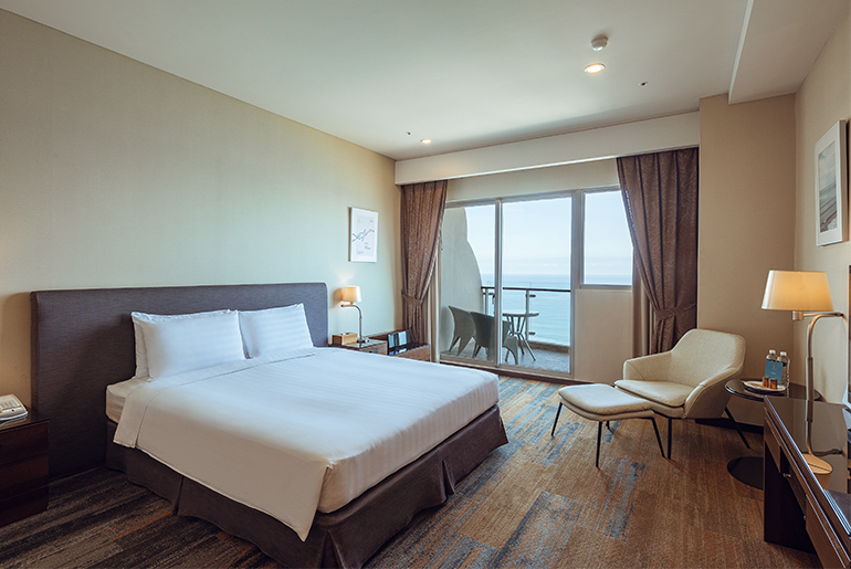 得天獨厚的地理優勢,會館精心打造125間各式舒適客房,每間客房均有面海觀景落地窗,簡潔的室內優雅設計,處處可見貼心巧思。